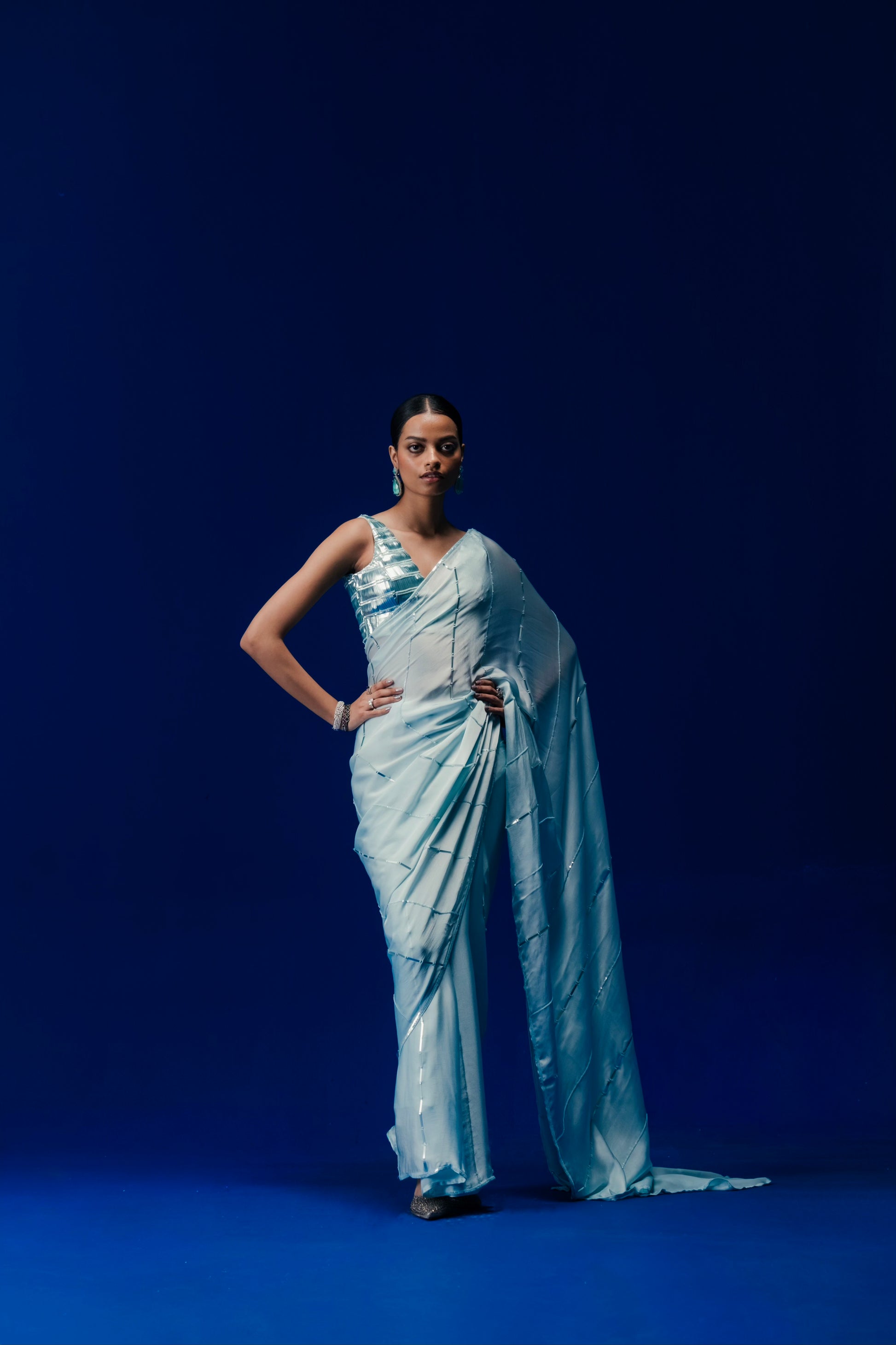 Blue satin saree with sequins embroidery in vertical pattern paired with blue embroidered v neck blouse and a petticoat
