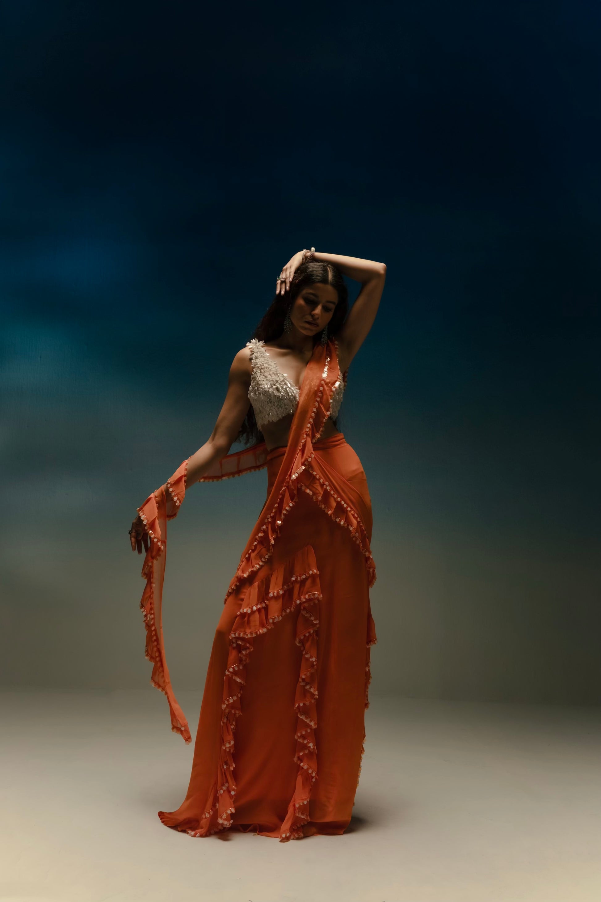 Shimmer white sequins hand embroidered blouse paired with orange frill style drape saree skirt with sequins detailing