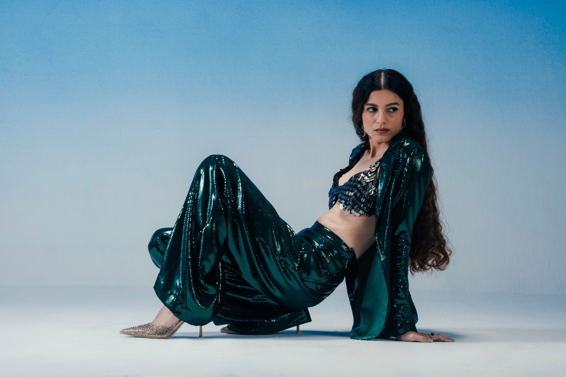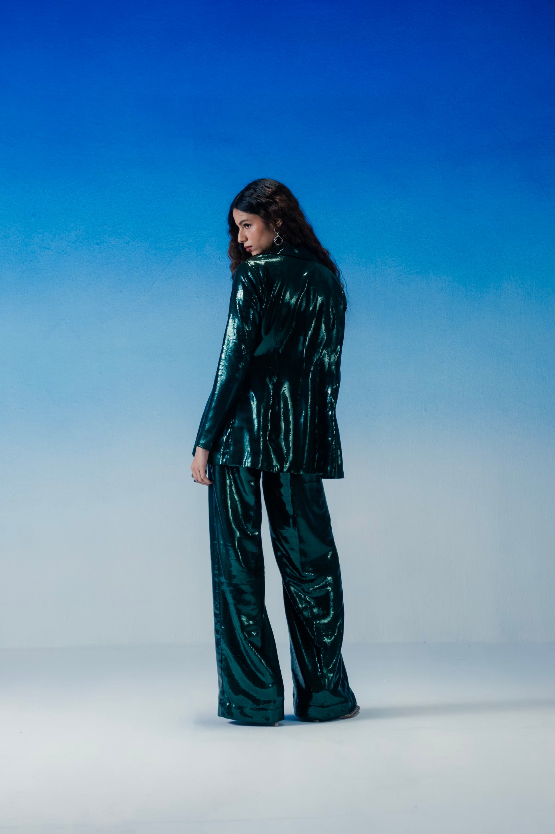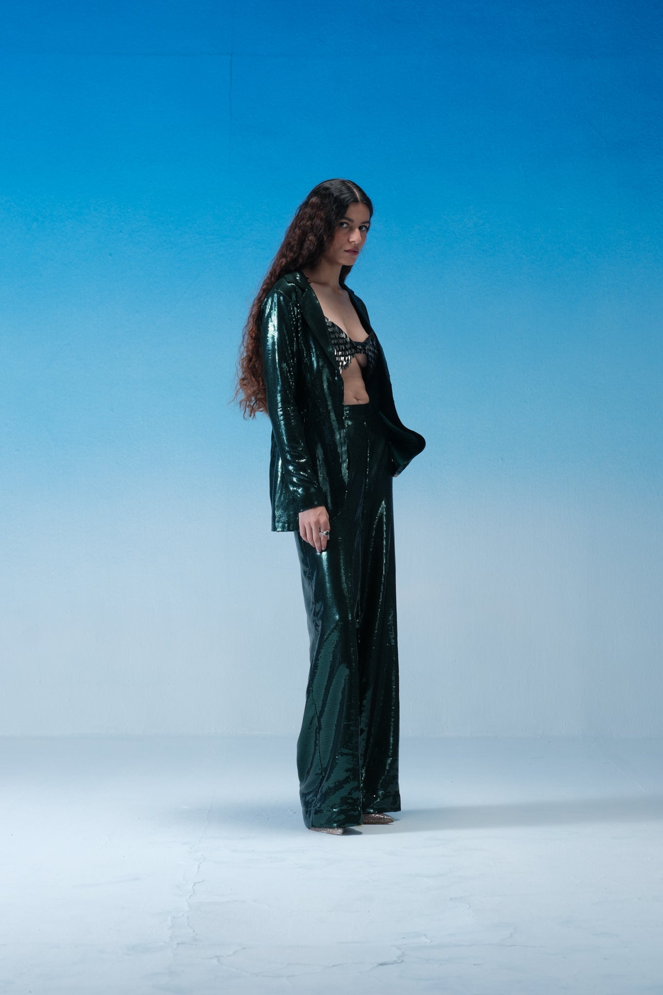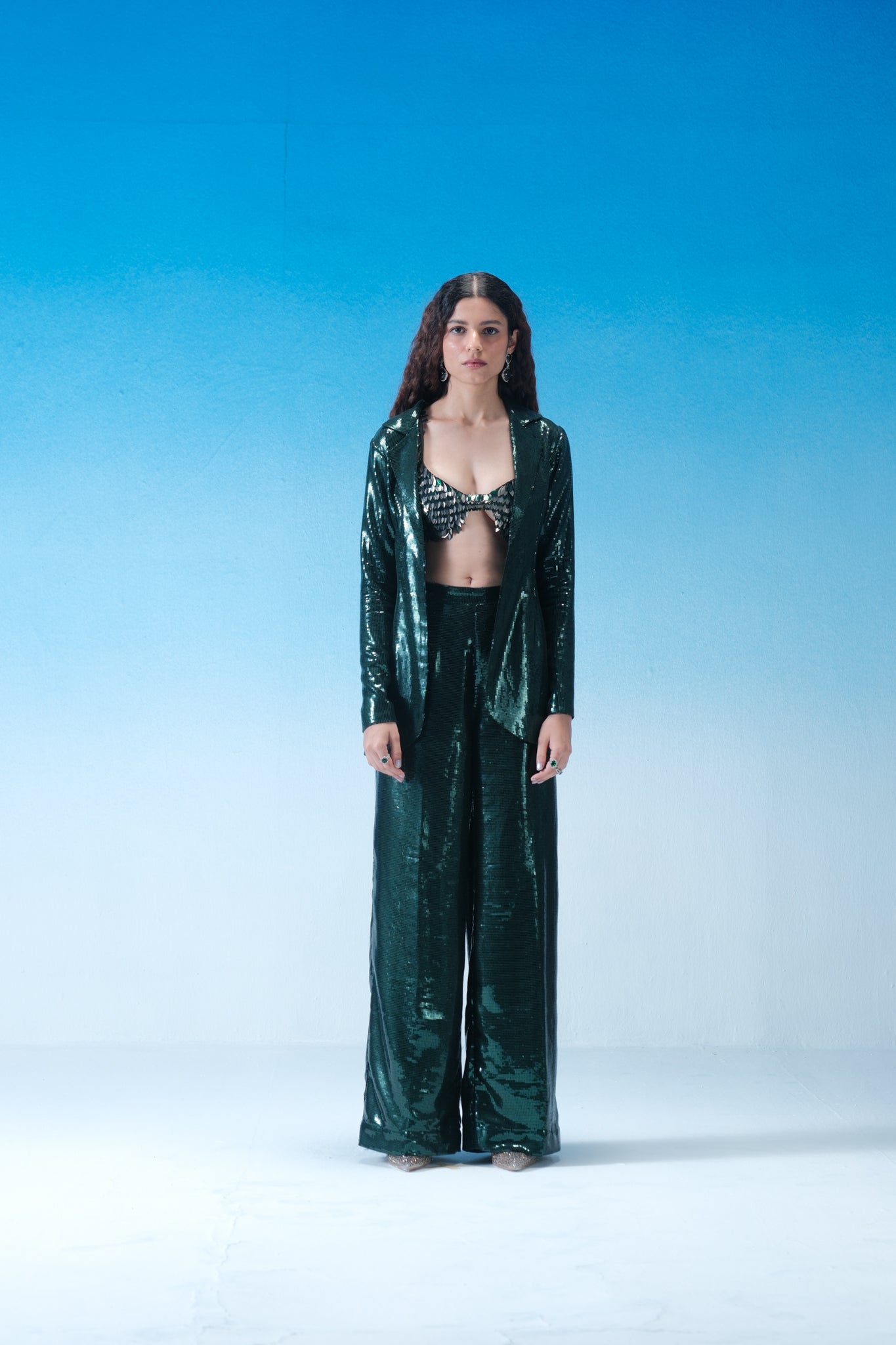 Shimmer green suit paired with hand embroidered bralette which has green and silver sequins paired with shimmer pants