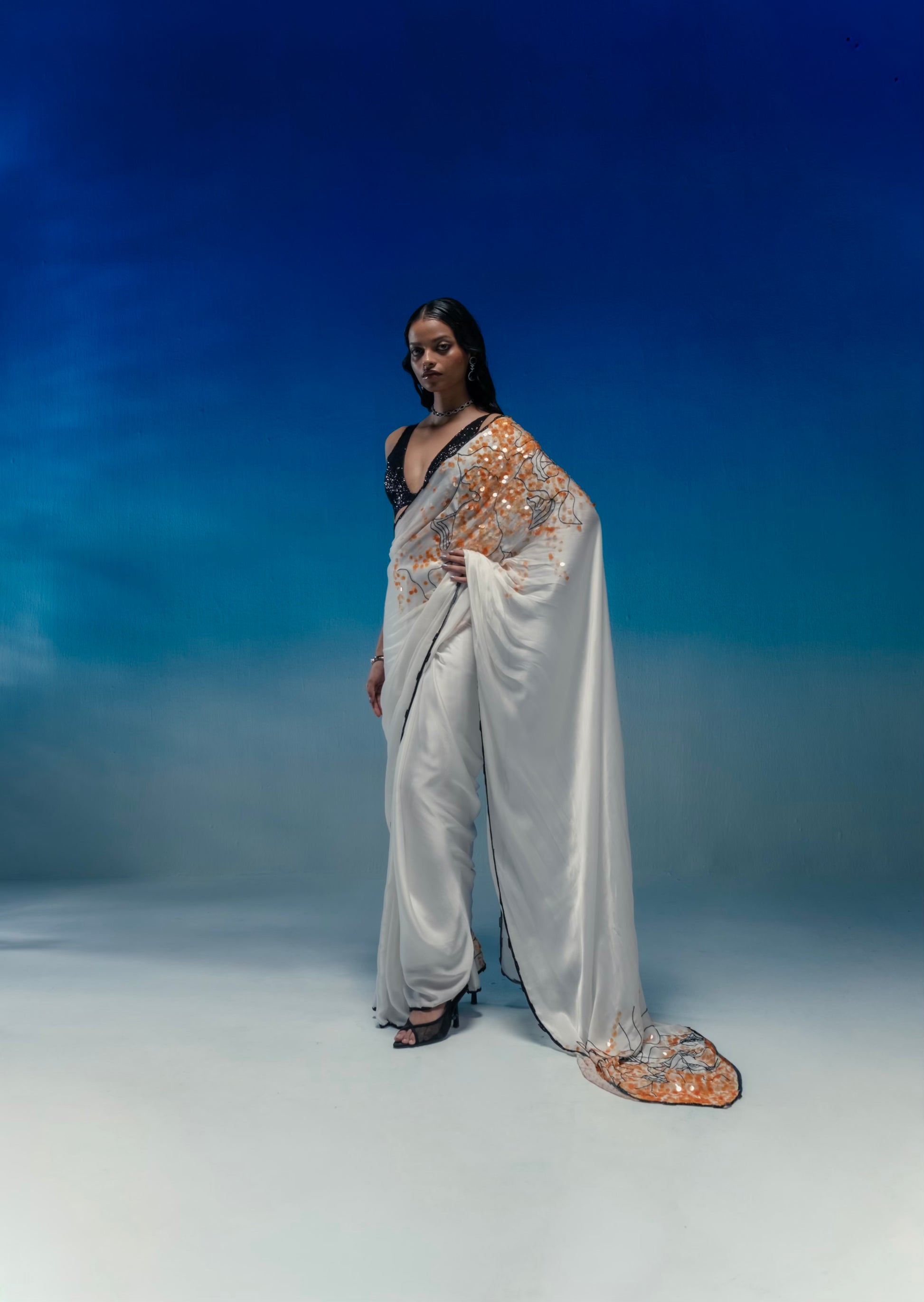 Saree inspired by koi fish. White satin saree having abstract sequins and cutdana handwork paired with black sequins blouse