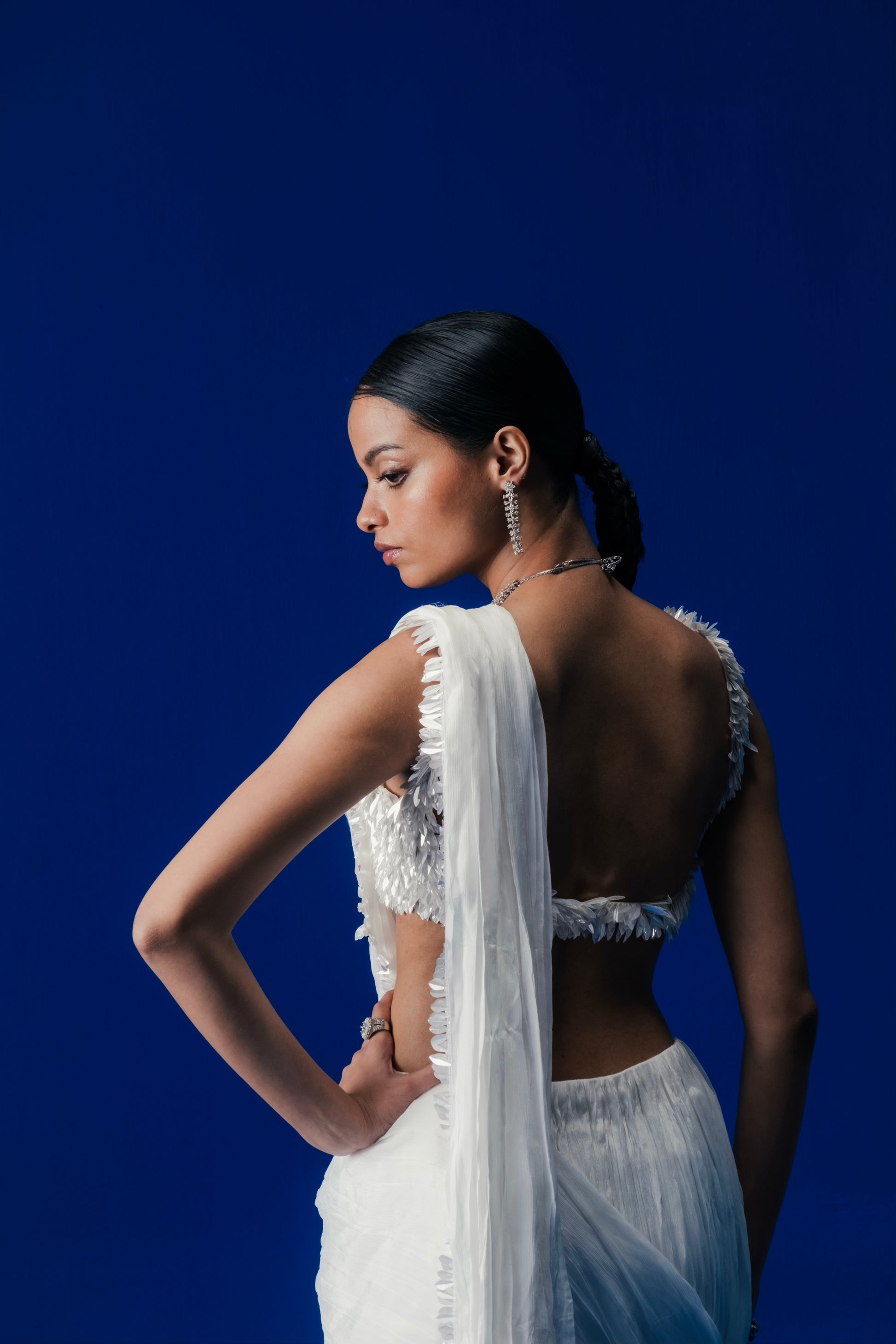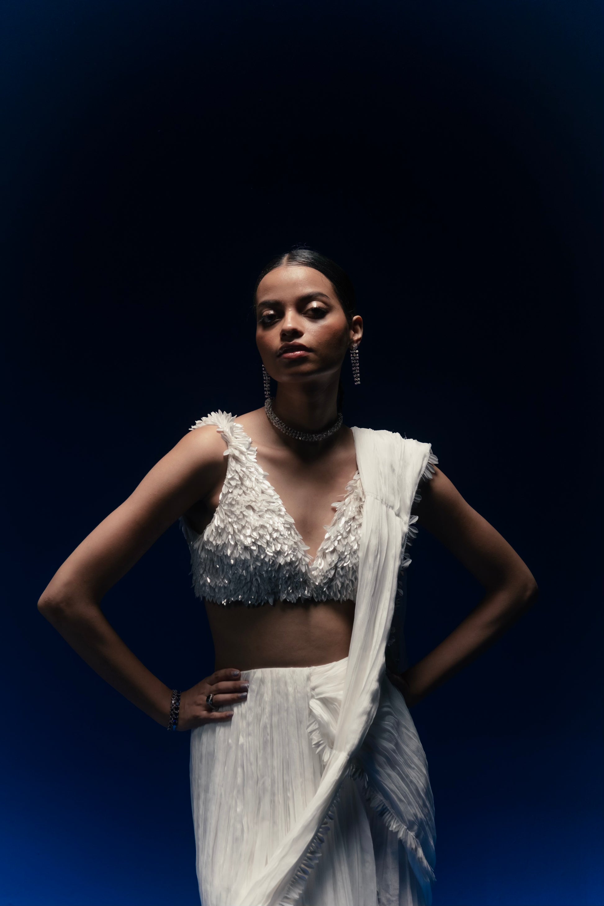 Withe shimmer blouse with feather sequins paired with georgette drape slit saree with sequins detailing same as blouse